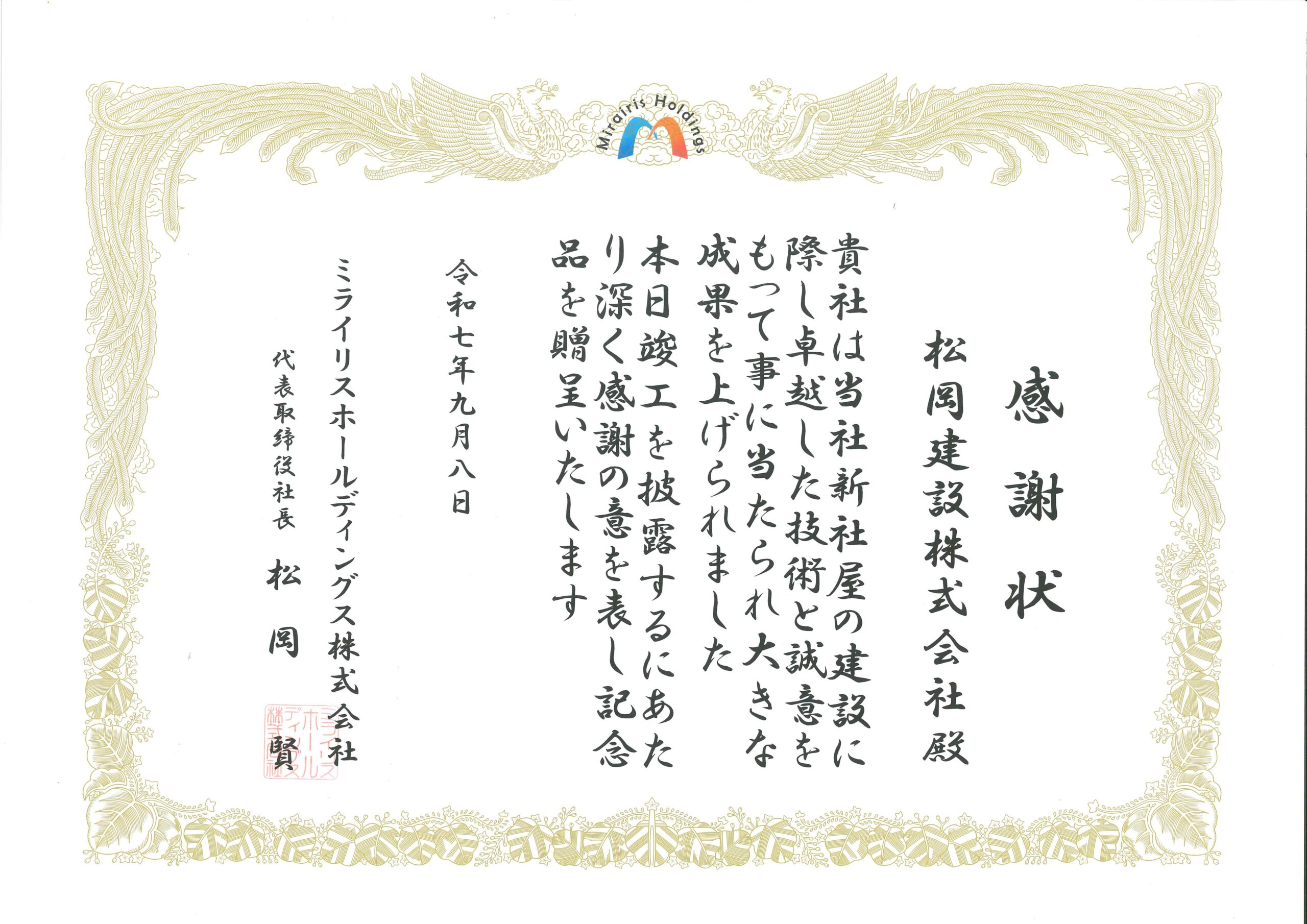 この度、ミライリスホールディングス株式会社 代表取締役社長 松岡 賢様より、新社屋建設工事について感謝状を賜りました。