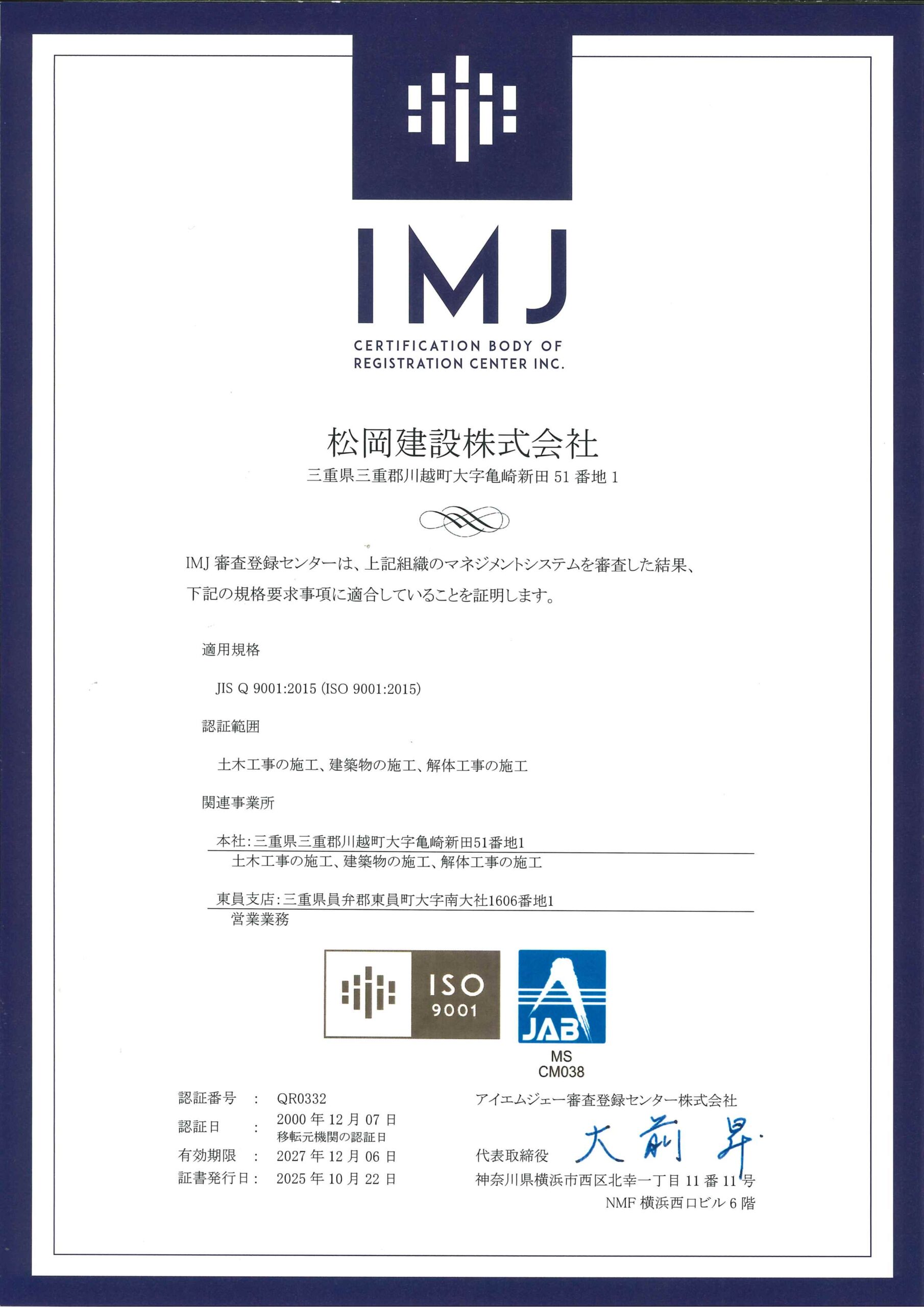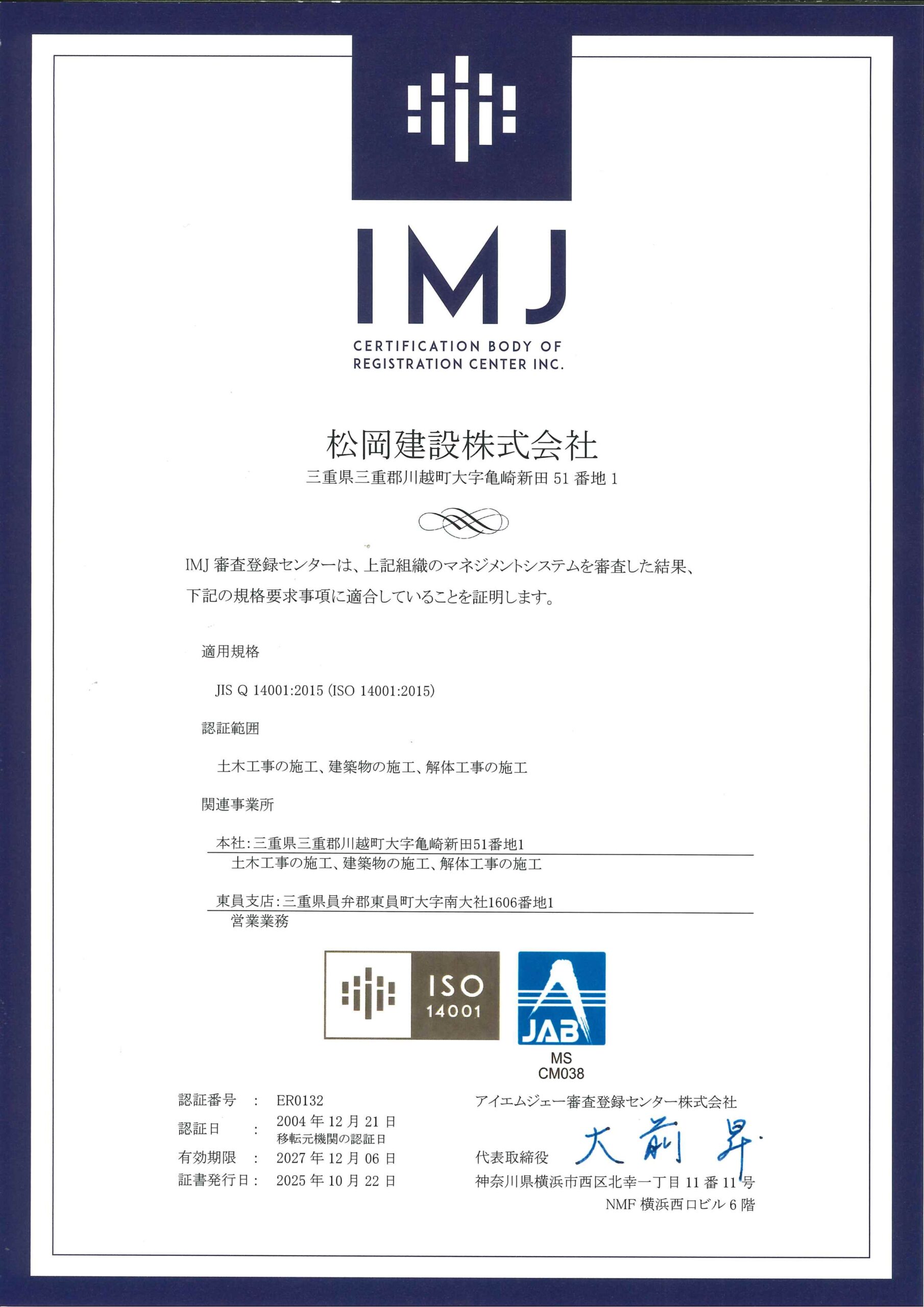 | 認証範囲 | 土木工事の施工、建築物の施工、解体工事の施工 |